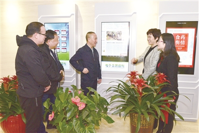 图为宋宇峰(左三)一行参观中国健康传媒集团一层大厅的报刊电子显示屏/摄影报道 李雪墨 熊昌彪