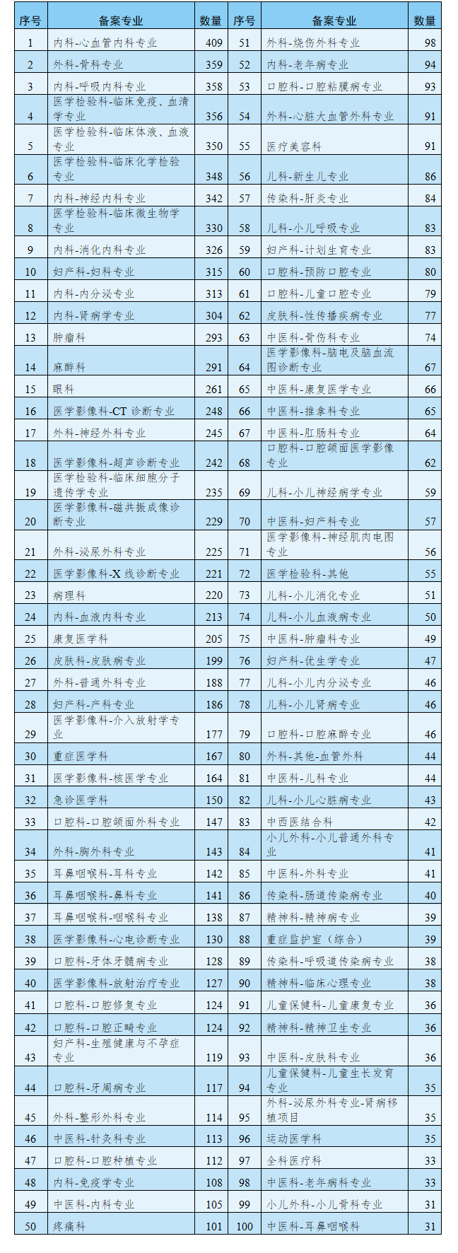 截止2018年12月31日,完成医疗器械临床试验机构备案的机构中,共备案1409个临床专业,内科-心血管内科专业,外科-骨科专业,内科-呼吸内科专业,医学检验科-临床免疫、血清学专业,医学检验科-临床体液、血液专业,医学检验科-临床化学检验专业,内科-神经内科专业,医学检验科-临床微生物学专业,内科-消化内科专业和妇产科-妇科专业是备案前十名的专业。相关图表如下: