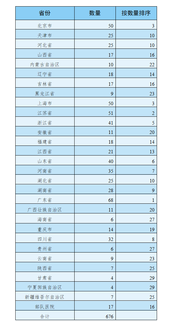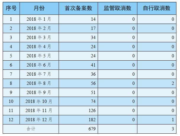 截止2018年12月31日,共有完成679次备案,其中机构自行取消3次,所以676个机构完成了医疗器械临床试验机构备案工作。自行取消备案的3个机构为:四川大学华西医院、沈阳爱尔眼视光医院、合肥高新心血管病医院,但这三个机构又重新完成了备案。相关图表如下: