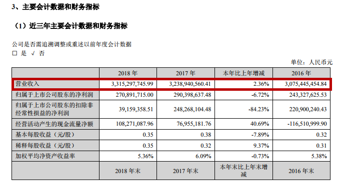 今年4月太安堂发布了2018年的年报,数据显示,2018年公司实现营收33.15亿元,同比增加2.36%;净利润2.71亿元,同比减少6.72%;归属于上市公司股东的扣除非经常性损益的净利润为3915.94万元,同比下降84.23%。