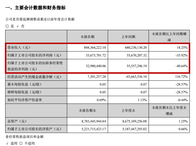 中国食品药品网讯(记者 郭婷) 近日,广东太安堂药业股份有限公司(002433.SZ,以下简称太安堂)发布了2019年第一季度报告:2019年1~3月,其营业收入8.04亿元,同比增长18.25%;归属于上市公司股东的净利润3567.37万元,同比下降35.92%;归属于上市公司股东的扣除非经常性损益的净利润3298.04万元,同比下降40.64%。