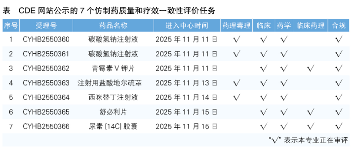 6.CDE网站公示7个仿制药质量和疗效一致性评价任务(详见表),涉及碳酸氢钠注射液等品种。