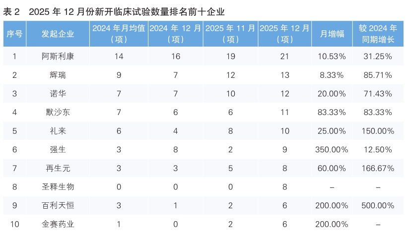 根据美国Clinicaltrial数据库数据,2025年12月份,全球新开由企业资本主导的临床试验总数为868项,数量环比上升43.47%;单月新开临床试验数量高于2024年同期水平,同比上涨28.59%。值得注意的是,我国有3家企业进入新开临床试验数量排名前十榜单,分别为圣释生物、百利天恒和金赛药业。
