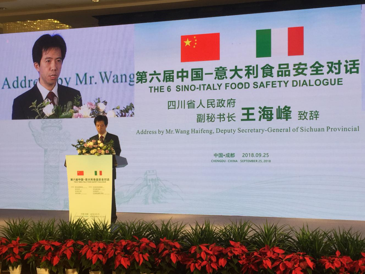 9月25日,第六届中国—意大利食品安全对话在成都举行。来自中国、意大利两国政府领导、企业嘉宾、专家学者共聚蓉城,围绕“食品领域风险评估和防控”主题,共话食品安全,共谋发展大计。意大利驻华大使谢国谊、国家市场监督管理总局副局长孙梅君、四川省人民政府副秘书长王海峰等出席活动并致辞,四川省食品药品监督管理局党组书记、局长鞠波主持活动。