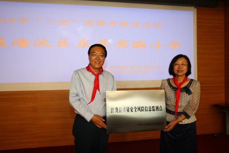 图为陈钢向海淀区东升实验小学颁授“消费品质量安全风险信息监测点”牌匾
