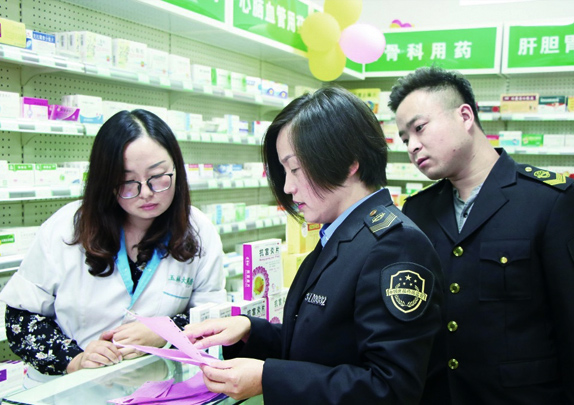 图为执法人员在一家药店检查索证索票情况。本报记者 王宣淞 摄