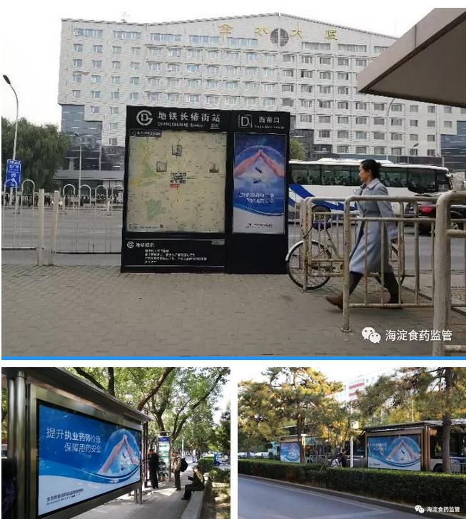 “全国安全用药月”期间,执业药师注册中心选择北京中心城区人流密集的海淀黄庄南站、宣武门东、双井桥东站等公交站亭及长椿街地铁站等几十个站点,采取固定宣传点和流动宣传点两种方式,在同一时间段集中设置“提升执业药师价值 保障用药安全”大型灯箱公益广告。