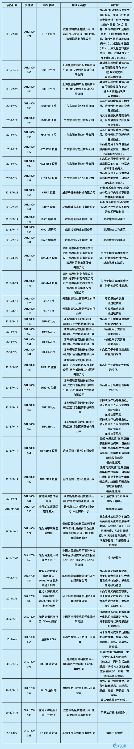 对这49条化学和生物新药受理号进行筛选,其中中国1类生物药9条,共8个品种,中国1类化药31条,共15个品种,恒瑞的JAK抑制剂SHR0302已处于临床II期,其余均为刚获批或处于初期阶段。具体如下表所示,从中我们可以看出同一品种制剂获得默示许可通过,可原料药的并未公示,获批最快的为MEK抑制剂FCN-159和HDAC抑制剂甲磺酸普依司他,于2018年10月9日承办。这两个品种均非特殊审批类型。其中最为明显的趋势是,化药绝大多数为2018年8、9月份受理的,9月份高达22个,共10个品种。生物药占比少,大部分于2018年受理。由此可见高效的审评模式明显加速药物研发进展。