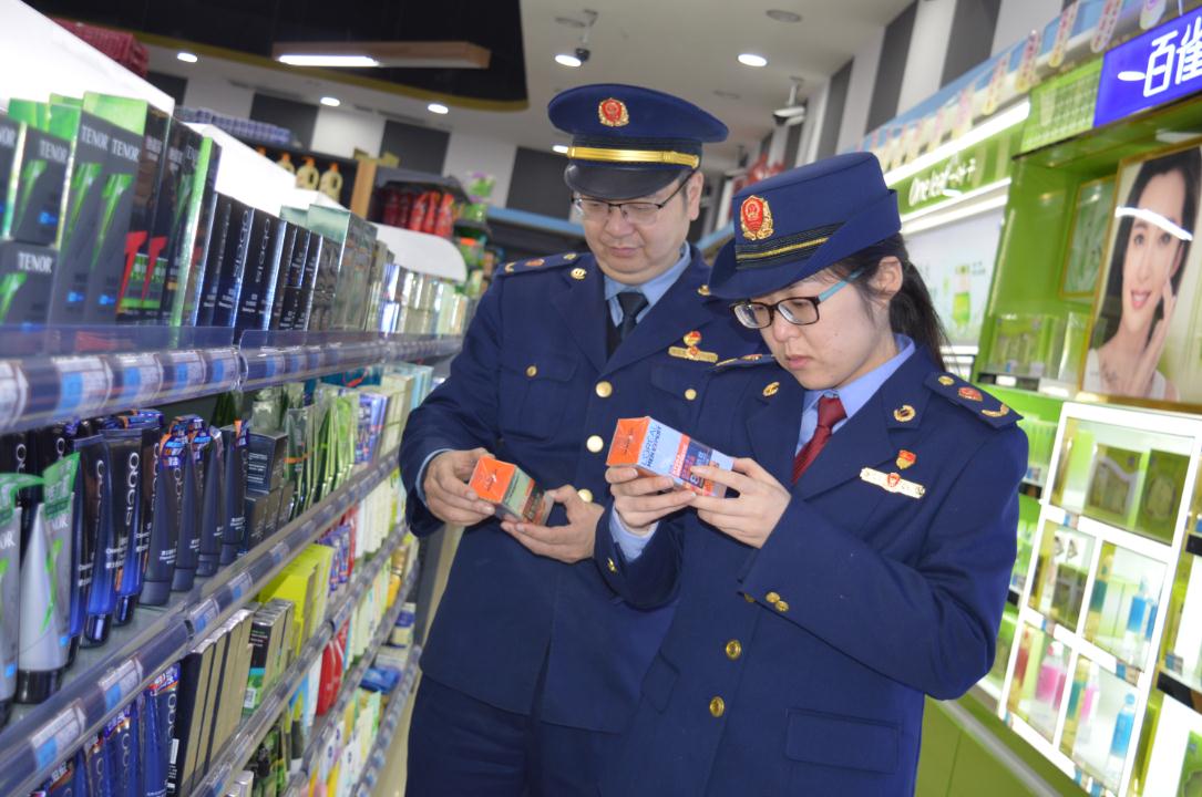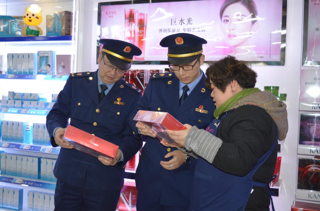 图为该局执法人员正在一家超市对一款美白保湿类套装外包装进行检查。孙建新 周建莉 摄影报道