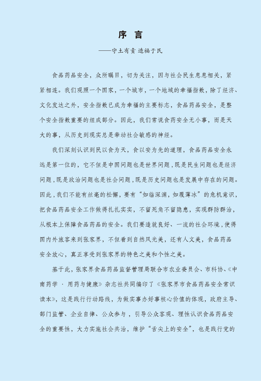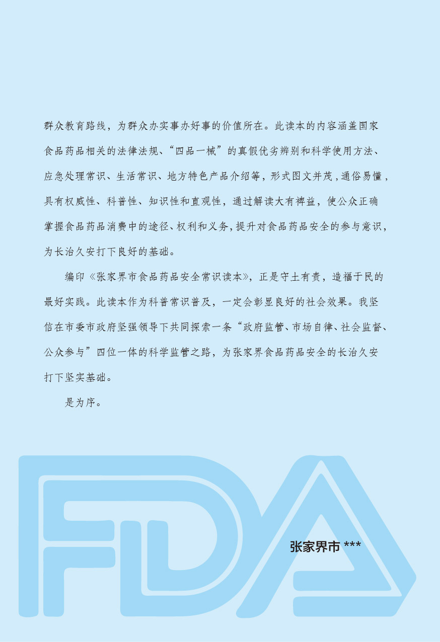 为积极推进食品药品社会共治工作,在全市范围内营造良好的食品药品安全监管氛围,提高全市居民科学、理性消费食品药品的安全水平,张家界市食品药品监督管理局组织编印了《张家界市食品药品安全常识读本》。