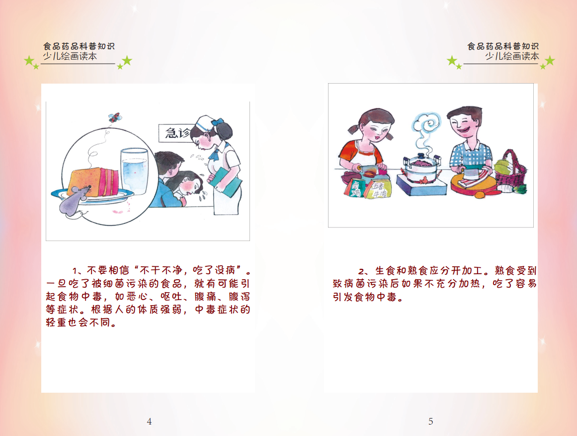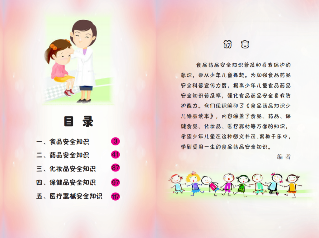 食品药品安全知识普及和自我保护的意识,要从少年儿童抓起。为加强食品药品安全科普宣传力度,提高少年儿童食品药品安全知识普及率,强化食品药品安全自我防护能力,安徽省食品药品监督管理局组织编写了《食品药品知识少儿绘画读本》。其内容涵盖食品、药品、保健食品、化妆品、医疗器材等方面的知识,希望少年儿童在这种图文并茂、寓教于乐中,学到受用一生的食品药品安全知识。