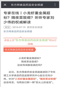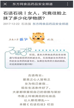 东方网食品药品安全频道微信公众号是基于频道内容及服务所开设的微信公众号,发布内容包括食药安全常识、图解政策截图、科普辟谣、安全提示、人物专访、食药新闻、食药监动态、专家在线等栏目。发布最新最权威的食药政策和新闻信息,为广大网友提供最权威的食品药品安全知识,有效引导食品药品安全舆论。2017共发布辟谣稿件70余篇,如:《无籽葡萄蘸了避孕药?面条里有胶?"朋友圈"里的这些健康谣言,你中招了吗?》、《辟谣丨"糖精枣"已成往事,"致癌说"无中生有》、《辟谣丨儿童食用辣条"中毒"死亡?纯属谣传!》等,原创稿件占比:68%。
