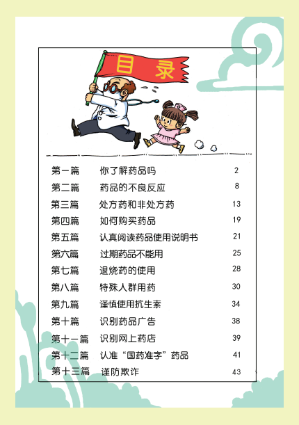 漫画选取群众用药安全中最值得注意的"药品不良反应"、"如何购买药品"、"药品使用说明书阅读"等13个方面,用喜闻乐见的漫画形式,告诉群众如何安全用药 、合理用药,让家庭和社会了解科学用药知识,远离不合理用药所带来的伤害。漫画通过进社区、进校园等各类宣传活动,共向群众发送了几万本,获得群众的普遍好评。