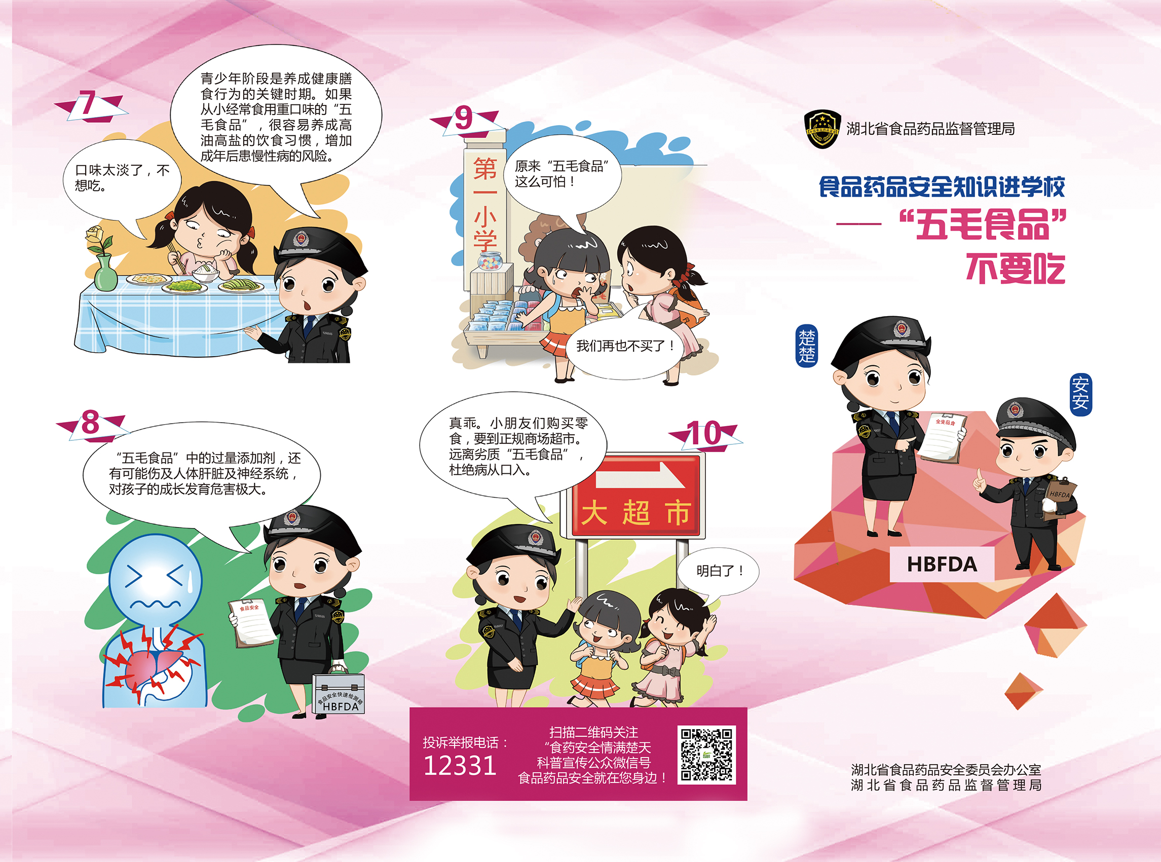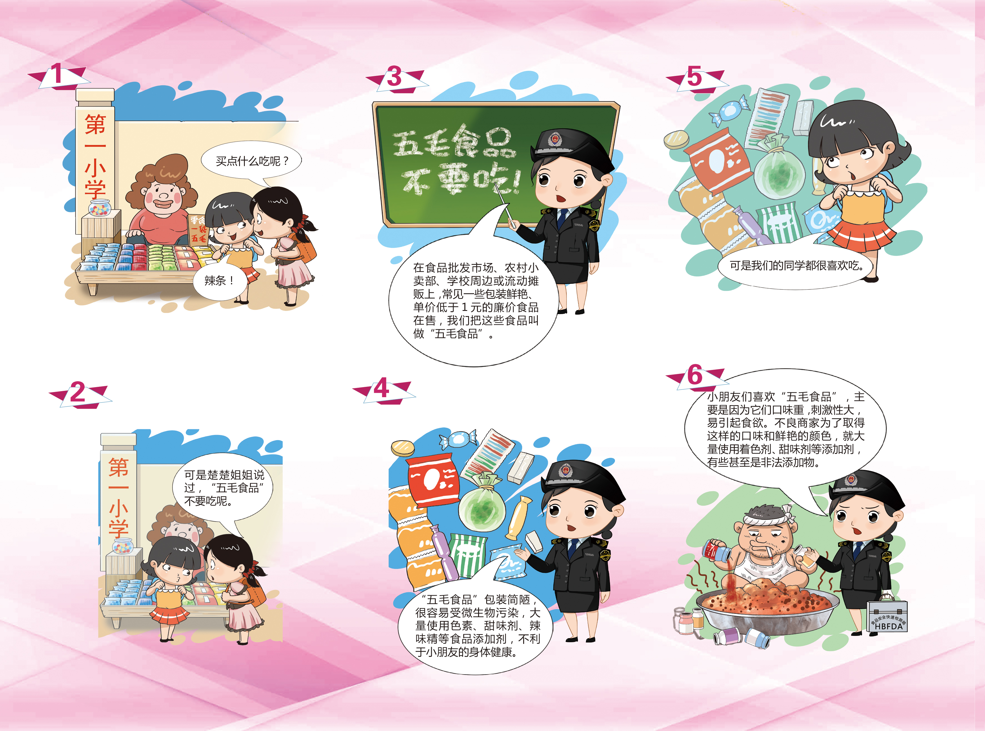 “五毛食品”安全知识科普宣传挂图是为了配合湖北省局开展的"五毛食品"食用风险和校园食品安全知识专项活动,由省局宣传处企划。该挂图采用同一主题下不同的人群制作了三种类型的挂图,分别是:五毛食品有风险,安全意识要提高;自觉远离五毛食品,保护自己的身体健康;抵制五毛食品,让我们共同努力,提醒"生产经营者"正视主体责任,自觉抵制五毛食品。挂图印刷8000张,面向全省17个地市州同步发行。